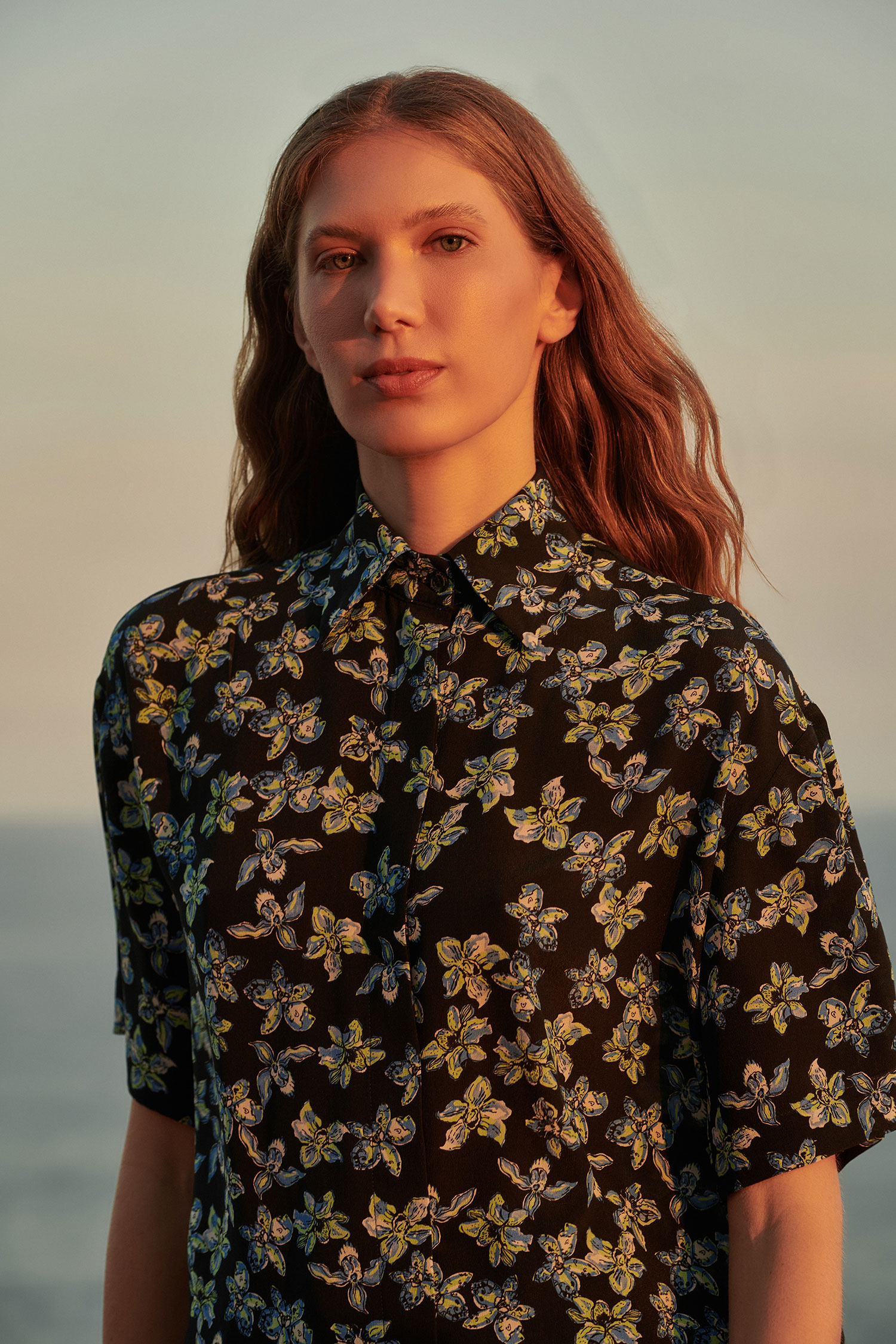 Camisa ampla de manga curta em seda com estampa exclusiva.
