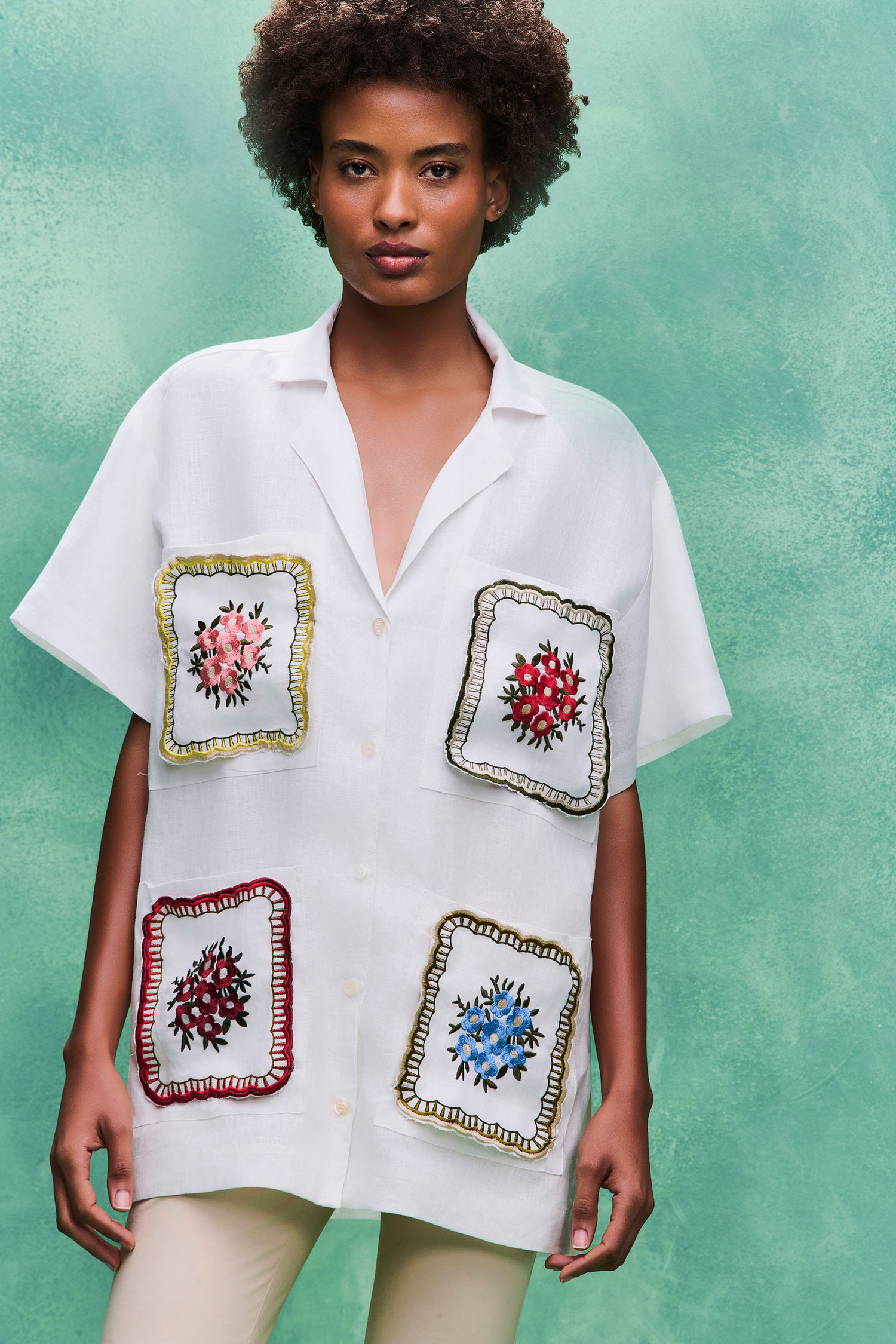 Camisa em linho com bolsos frontais bordados.