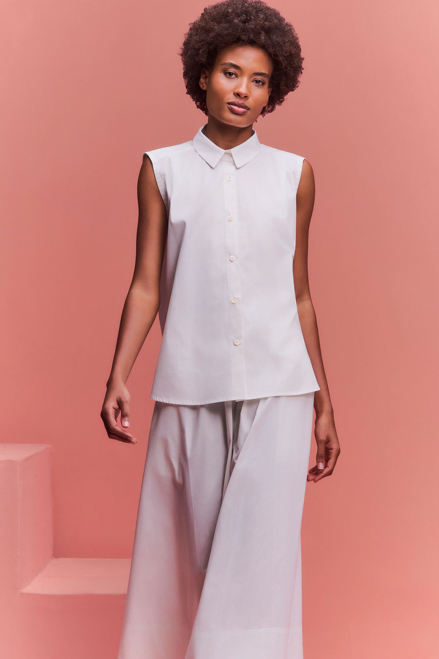 Camisa de tricoline ampla sem manga, com abotoamento frontal.