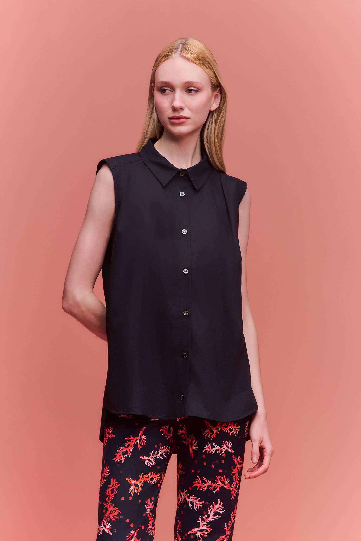 Camisa de tricoline ampla sem manga, com abotoamento frontal.