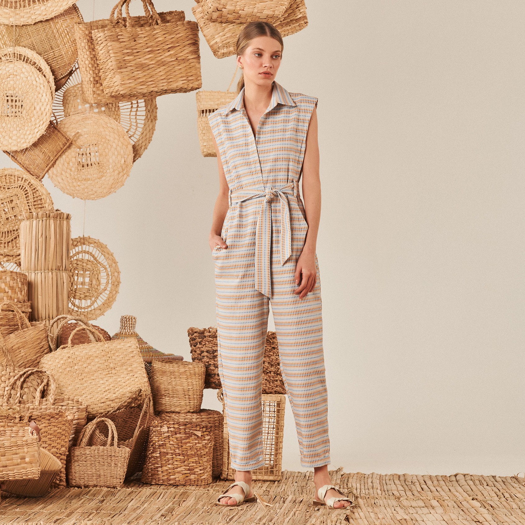 Macacão sem manga com leve ombreira em jacquard de algodão.