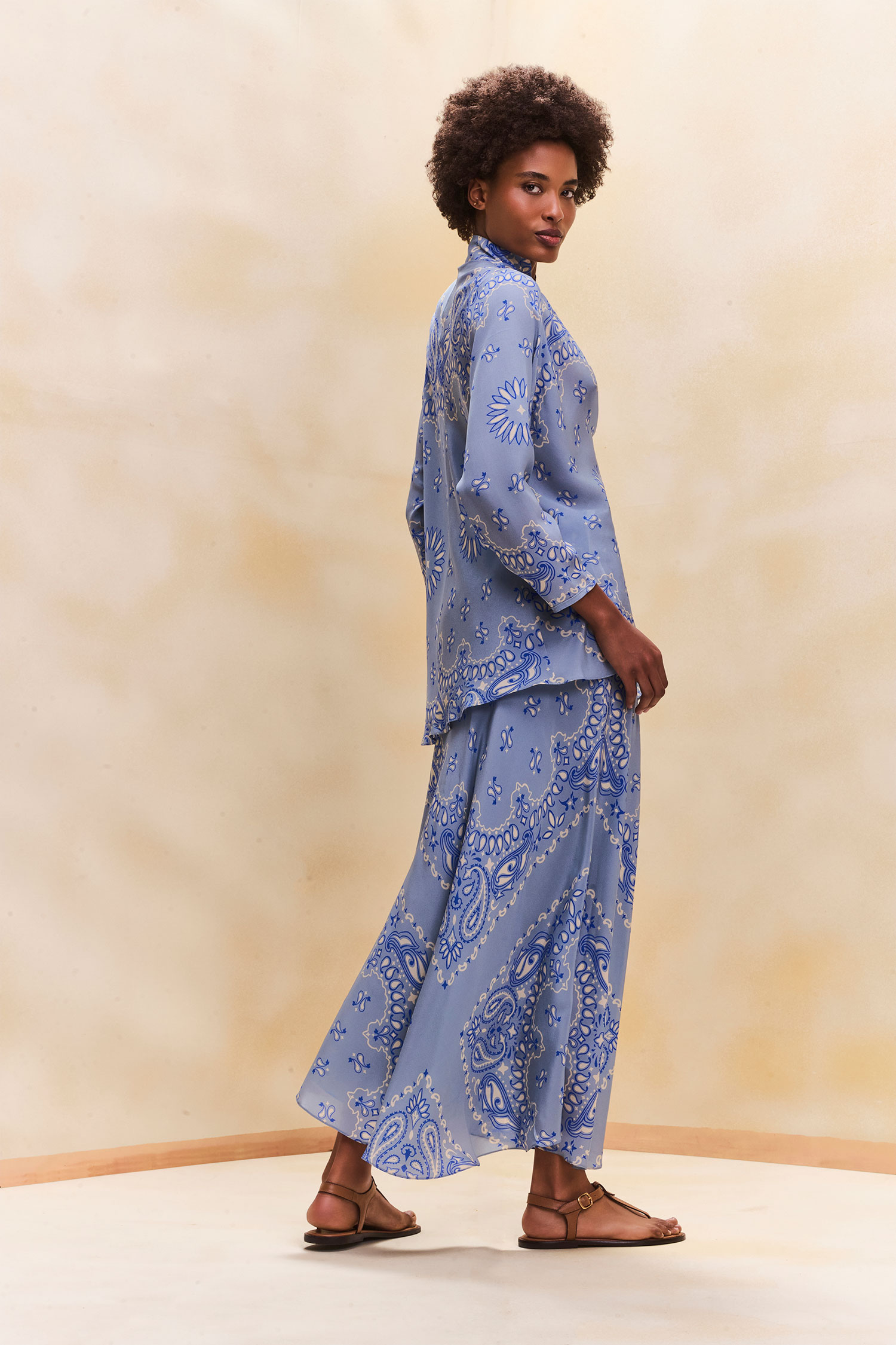 Saia midi modelo êvase em seda com estampa exclusiva.